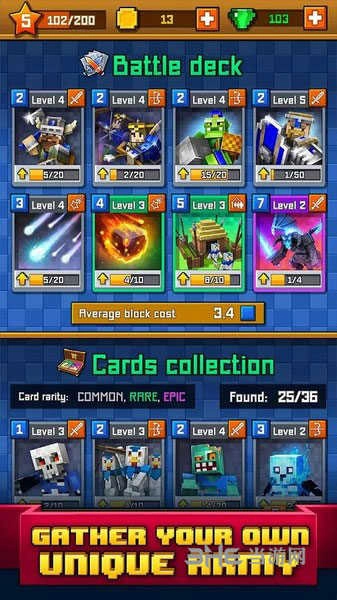 7、通过赢得战斗获取各式各样的宝箱,收集全新卡牌并对其进行升级;让你的阵营里拥有众多令人惊叹的士兵与战争机器。