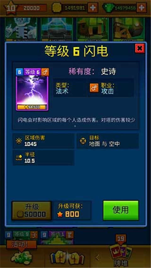 5、排兵部阵打败敌人,拆掉对方防御塔;升级我方卡牌和城堡;