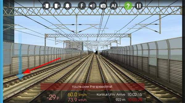 3、当界面显示“You're over the speed limit”提示时,表明列车当前处于超速状态,工作人员需要立刻采取降速措施,使列车运行速度维持在规定的限速区间内,否则会对相关评价产生不良影响。