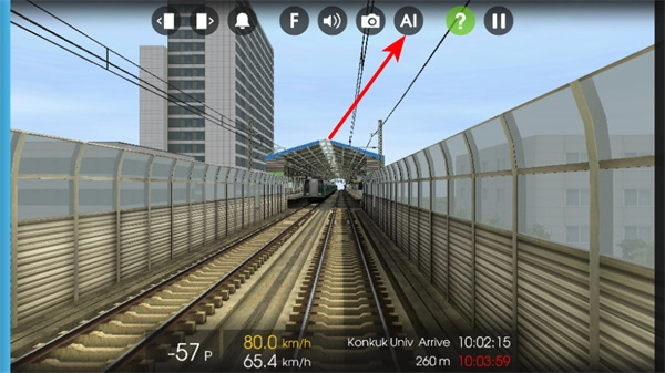 4、点击AI按钮,可开启人工智能辅助驾驶功能,在不熟悉驾驶操作时,可借助该功能学习列车驾驶的节奏技巧。
