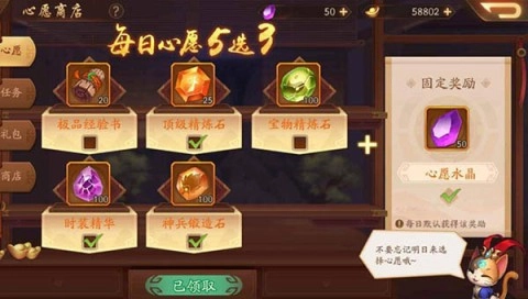 在角色等级达到56级时,心愿商店将正式解锁。届时,你可以使用心愿水晶和军团贡献来兑换武将的化身符。其中,金色与红色品质的武将化身符较为稀有,建议通过积极参与各类活动来获取更多此类道具。