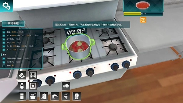 作为一款追求真实感的料理模拟游戏,游戏里涵盖的厨房道具种类十分丰富,操作体验也相当贴近现实。开发者还十分贴心地在每个用具旁附上了知识小贴士,方便玩家随时查阅;此外,游戏还设有专门的详细教学关卡,就算是烹饪新手,也能在教程的引导下迅速熟悉操作。