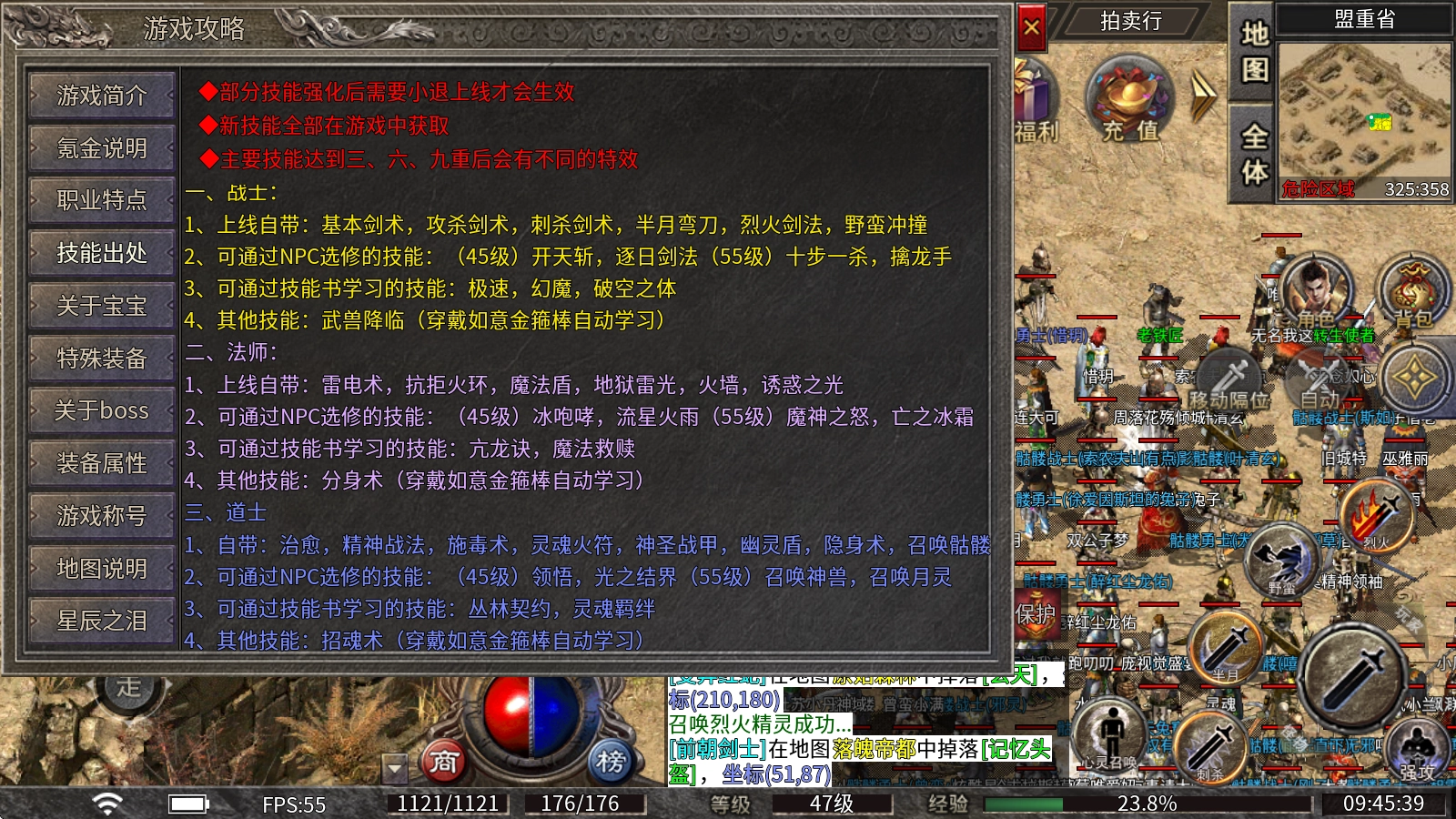 2、可通过NPC选修的技能如下:45级可选修开天斩、逐日剑法;55级可选修十步一杀、擒龙手。