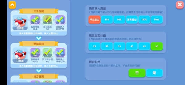情况和上面诊断室的情况一样,我们可以根据病人数量来安排医生——哪里病人多,就把医术精湛或者星级高的医生安排到哪里。这样做有助于提升医生和护士的等级,进而提高他们的医术水平和治疗效率,医院的治愈率也能得到保障。只有这样,我们才能一步步提升医院等级,从最初的三无医院,逐步发展为野鸡医院、地方医院、网红医院、挂牌医院、正规医院、重点医院、超级医院、特级医院、星耀医院、荣誉医院、泰斗医院、医学之光、小镇之光,最终实现名垂青史的目标。让我们一起努力,朝着名垂青史的方向前进吧!!!
