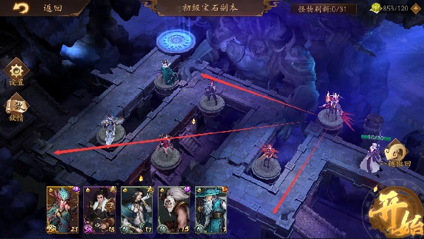 为什么这么说呢?在初级宝石副本里,阿暖站在后方蓄力憋出大招后,能有效应对不少带眩晕技能的幻灵怪物。阿暖在这个副本中有两个站位可选:一是站在右下角,蓄力满后按图中所示方向释放大招,多尝试几次方向就能发现,正在转弯的敌人会受到两次伤害,记得要优先击杀眩晕怪物哦。